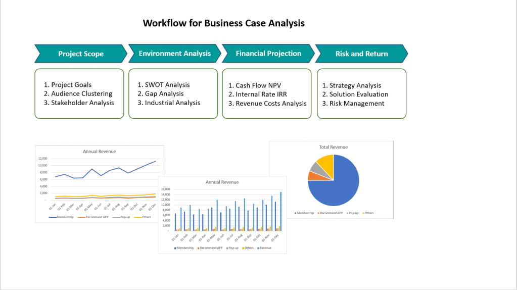 The following workflows are used to analyze the business project by considering the internal revenue model and the external environmental factors. The questions that we could raise about the revenue generation, such as how quickly the revenue has increased through the year, the allocation of each revenue sources, and which revenue source has potential increase in revenue.