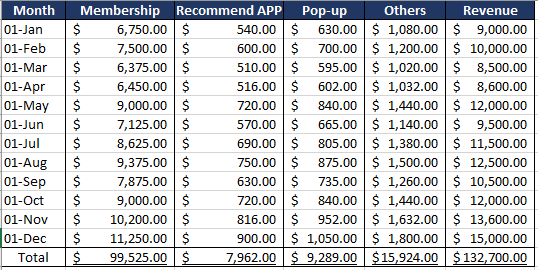 We collect the monthly and annual revenue of a coffee shop and break down the revenue into categories such as membership, recommend App, Pop-up and others. By analyzing the vertical and horizontal increase of each market segments, we would like to identify the new possibility of revenue increase.
